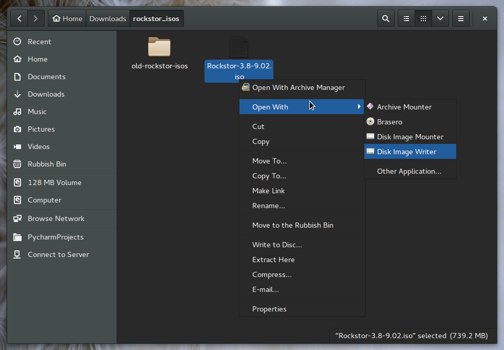 From within Nautilus the file manager Right click on the Rockstor iso to invoke the Disk Image Writer.